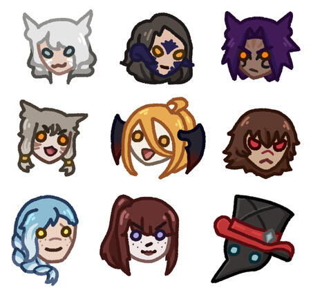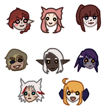 these are the oldest minis i've made. they were originally raid icons for me and my static, so we could make handy diagrams with our faces on them!